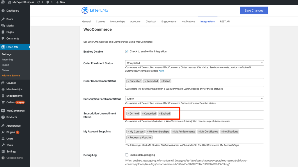 Once the Woo Commerce Subscription status moves to cancelled, on hold, or expired the user will instantly be removed from access to their course or membership. You can confirm this in your LifterLMS > Settings > Integrations > WooCommerce as detailed below: